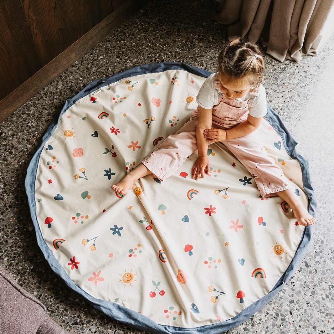 Mit der Matte Funny Days Play&Go zieht Fröhlichkeit ins Kinderzimmer ein. Dieses vielseitige Produkt kombiniert eine großzügige Spielmatte mit einem praktischen Aufbewahrungsbeutel – gestaltet mit farbenfrohen Smileys, Regenbögen und Blumen, die für eine ausgelassene Atmosphäre sorgen. Die weiche Unterlage lädt zum kreativen Spielen, Träumen und Entspannen ein, während das freundliche Design Kinderherzen höherschlagen lässt. Am Tagesende verwandelt sich die Spielmatte mit wenigen Handgriffen in einen robusten Beutel, sodass Spielzeug schnell und ordentlich verstaut werden kann. So bleibt das Zimmer aufgeräumt und Spielspaß ist jederzeit griffbereit.