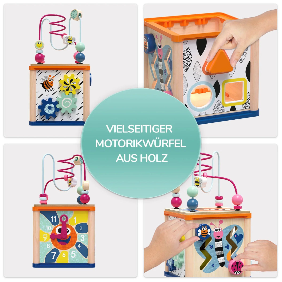 - Unterschiedliche Spielmöglichkeiten: Perlenlabyrinth, Formensortierspiel, Lern-Uhr, Drehzahnräder