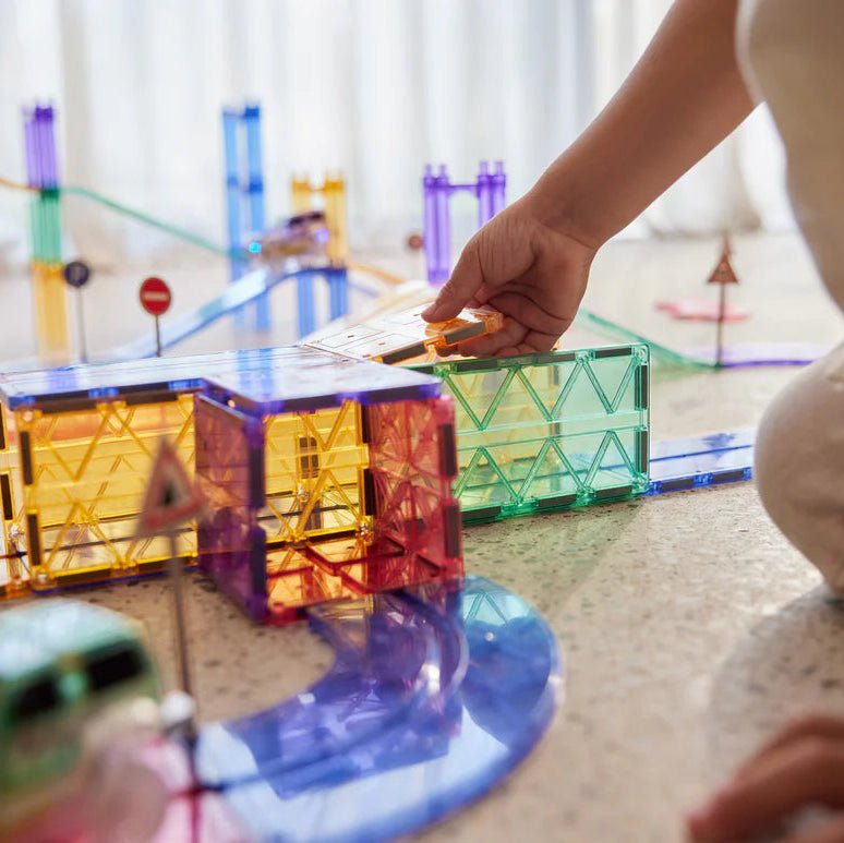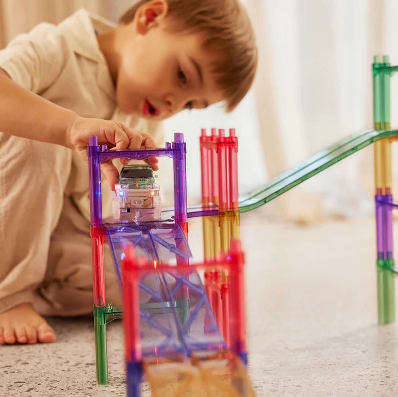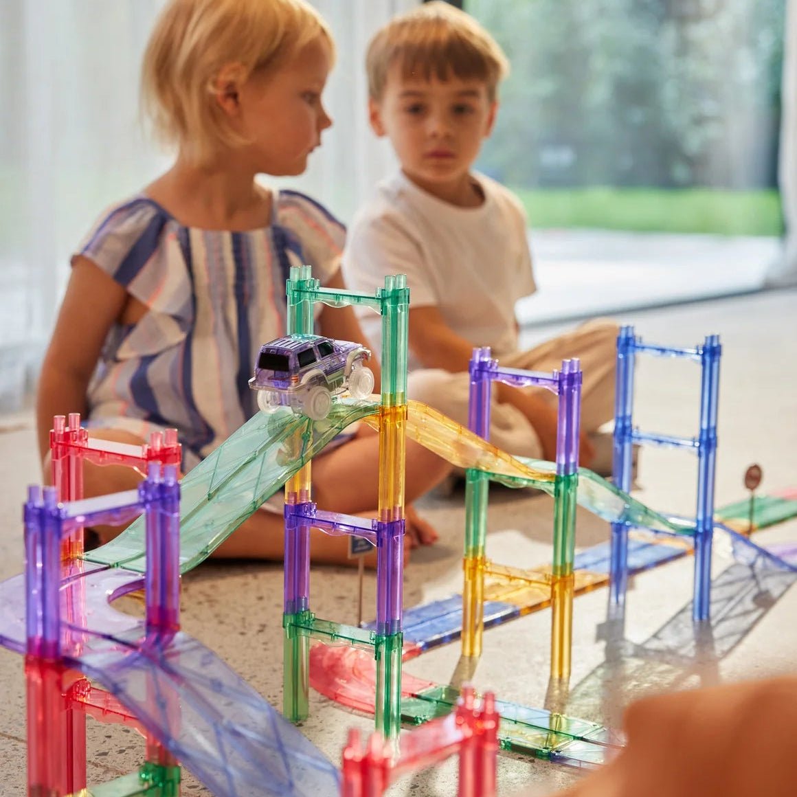 Erlebe unbegrenztes, grenzenloses Rennvergnügen mit dem 80-teiligen Pastell-Rennbahnset von Cleverclixx. Dieses farbenfrohe Pastell-Set ermöglicht es deinem Kind, aufregende Rennstrecken auf verschiedenen Ebenen zu gestalten. Elemente wie Verkehrsschilder, ein autonomes Auto und Säulen erweitern das Spielvergnügen.