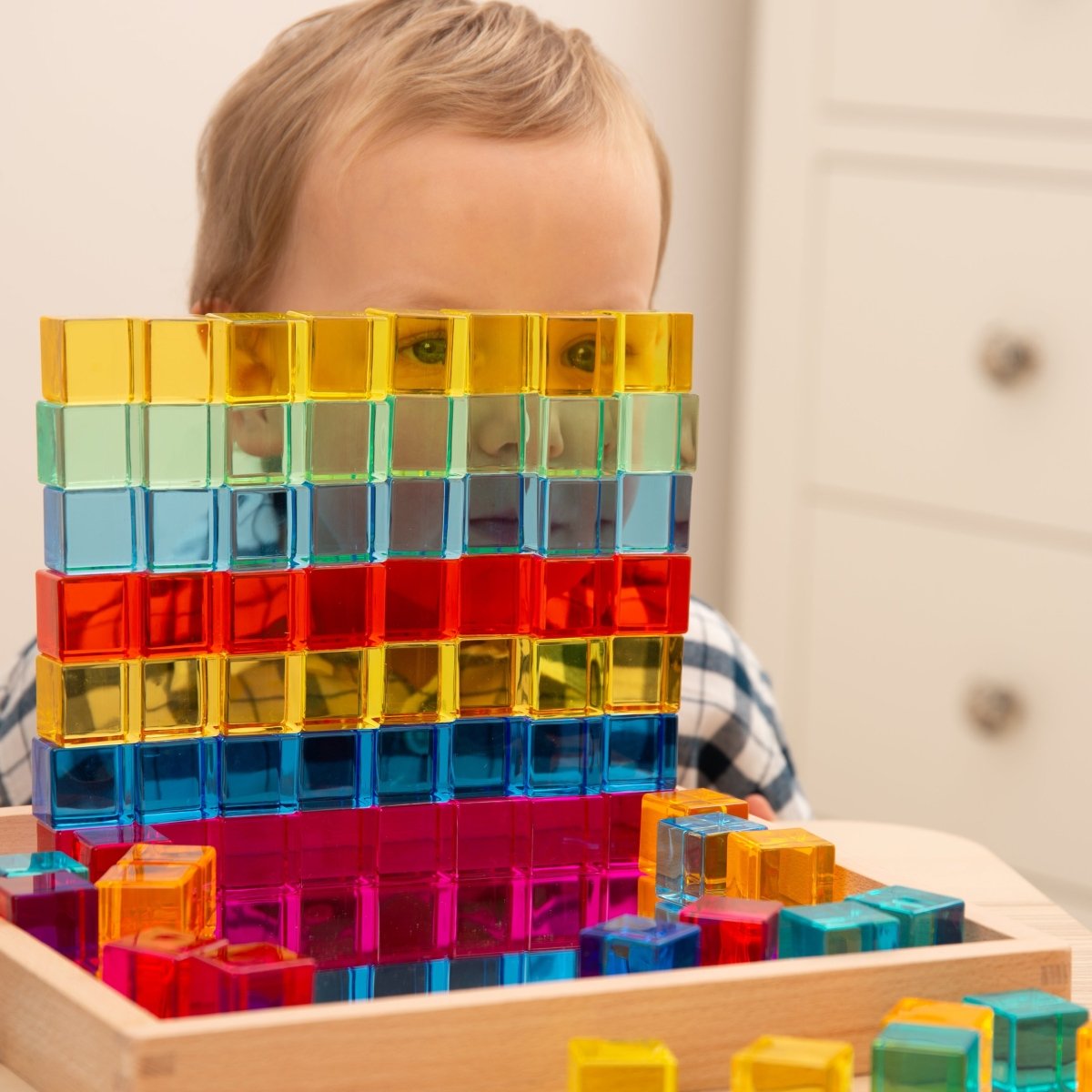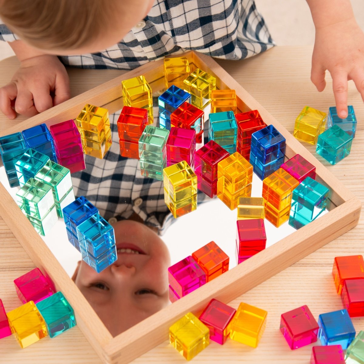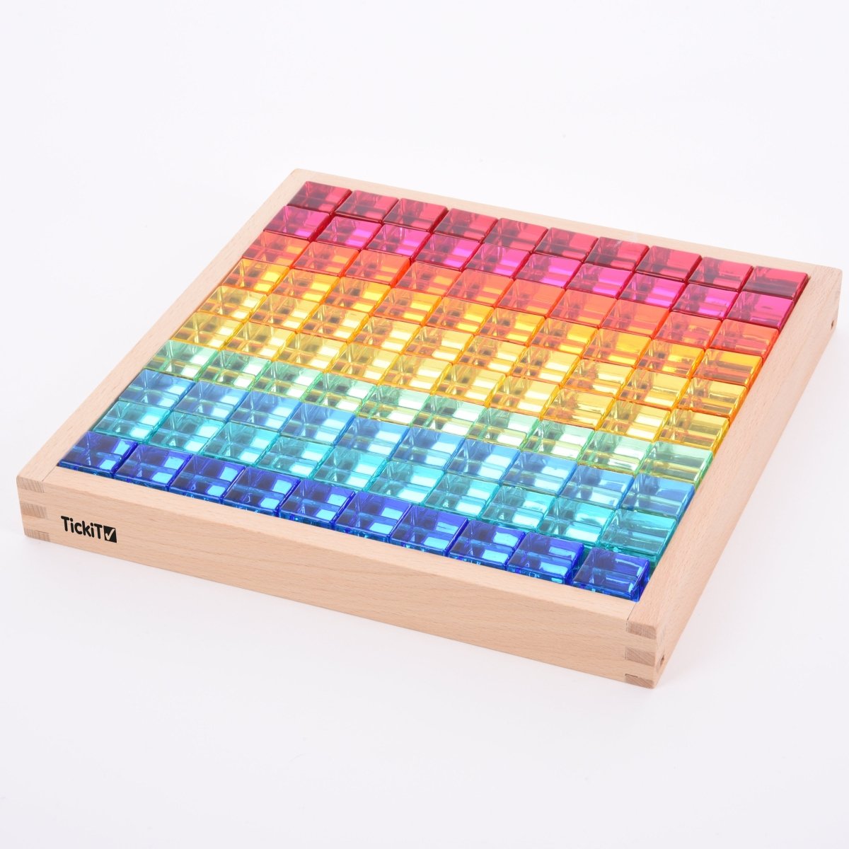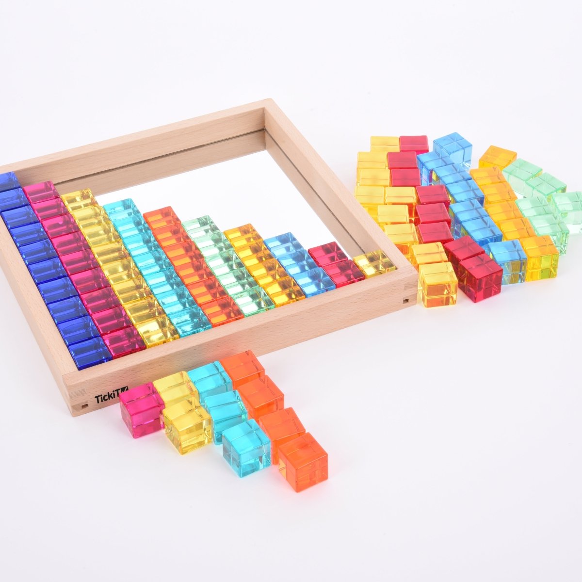 Entdecken Sie die farbenfrohen Edelsteinwürfel von Tickit® – ein hochwertiges Spiel- und Lernset, das fantasievolle Spielideen und mathematische Aktivitäten miteinander verbindet. Das Set besteht aus 100 funkelnden Edelsteincubes in zehn leuchtenden Farben, liebevoll verarbeitet mit glatten, taktilen Kanten. Die Edelsteinwürfel werden in einem stabilen Buchenholztablett mit sicherem Acrylspiegelboden präsentiert, der das Licht reflektiert und wunderschöne Farbeffekte erzeugt.