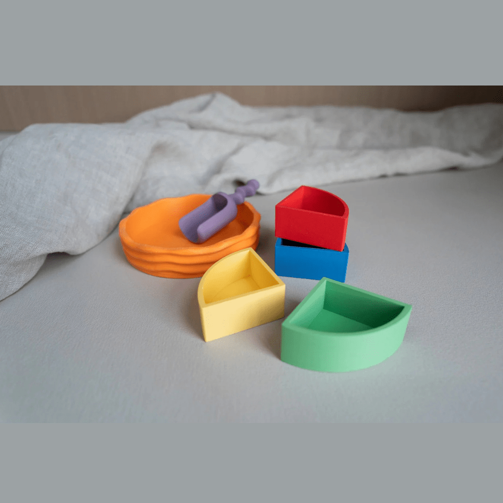 Das Grennn Kwartcirkel Set Regenbogen ist das perfekte sensorisches Set für Kinder ab 3 Jahren, die spielerisch ihre Kreativität und Sinneswahrnehmungen entdecken möchten. Die vielseitige Kombination aus einer orangen Wave Schale, vier bunten Viertelkreisen in Gelb, Rot, Grün und Blau sowie dem lilafarbenen Wave Spielschäufelchen macht diese Produktidee zu einem farbenfrohen Highlight im Kinderzimmer.