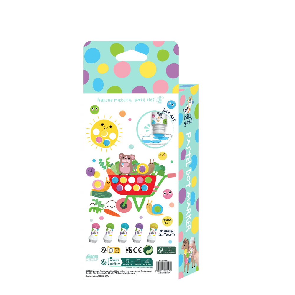 Entdecken Sie das hochwertige 5er-Set Punktmarker von HAKUYOKA – speziell entwickelt, um kleine Künstler bei ihren kreativen Projekten zu unterstützen. Dieses Set umfasst fünf leuchtende Pastellfarben, die Kinderaugen zum Strahlen bringen und eine Welt voller Fantasie eröffnen.