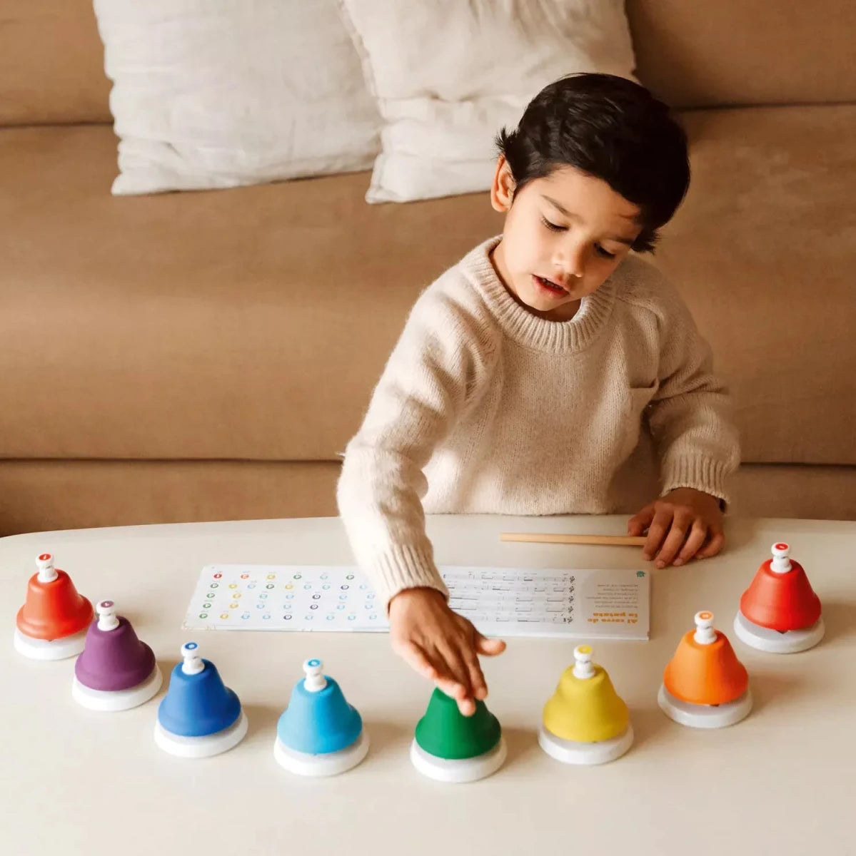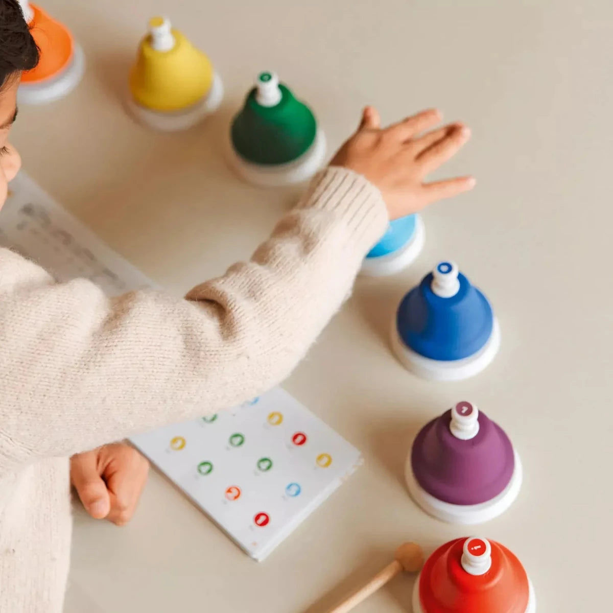 Entdecken Sie das hochwertige Musik Set Dingdangbu Push – Tastenglocken von JuegaConmigo! Dieses bunte Set besteht aus 8 einzeln gestimmten Tastenglocken, die speziell für kleine Kinderhände entwickelt wurden. Die Glocken lassen sich ganz einfach durch Drücken oder leichtes Schlagen mit dem beiliegenden Schläger spielen und erzeugen jeweils einen klaren, diatonischen Ton.