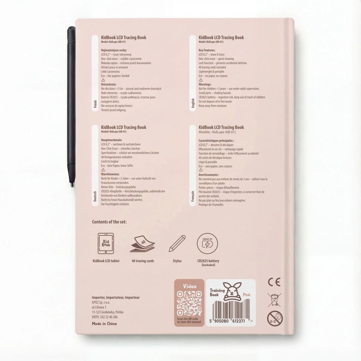 Das LCD-Tablet des Sets funktioniert ganz ohne Papier – per Knopfdruck wird der Bildschirm gelöscht und das Kind kann jederzeit neu starten. KidBook unterstützt so die Entwicklung von Konzentration, Feinmotorik und Selbstständigkeit. Es ist leicht, sicher, überall einsatzbereit und nach der Kidinex-Philosophie gestaltet: weniger Ablenkung, mehr Lernerfolg.