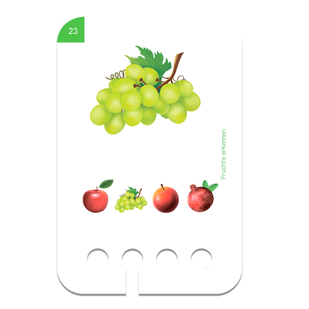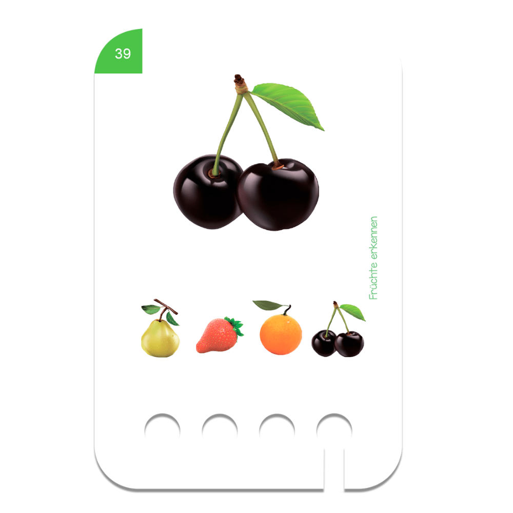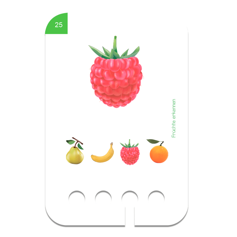 Früchte erkennen 2+ vom Kölner Lernspielverlag ist ein Kartensatz zur Förderung der Wahrnehmung und Zuordnung von Früchten, konzipiert für Kleinkinder ab 2 Jahren. Die liebevoll gestalteten Lernkarten sind als Ergänzung für den Lochkasten gedacht und bieten abwechslungsreiche Übungen rund um das Thema Obst.