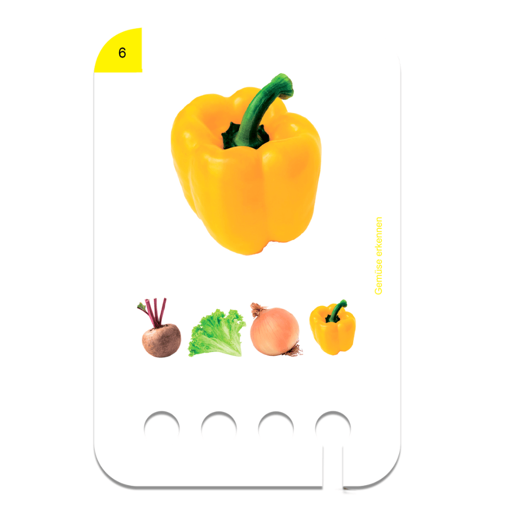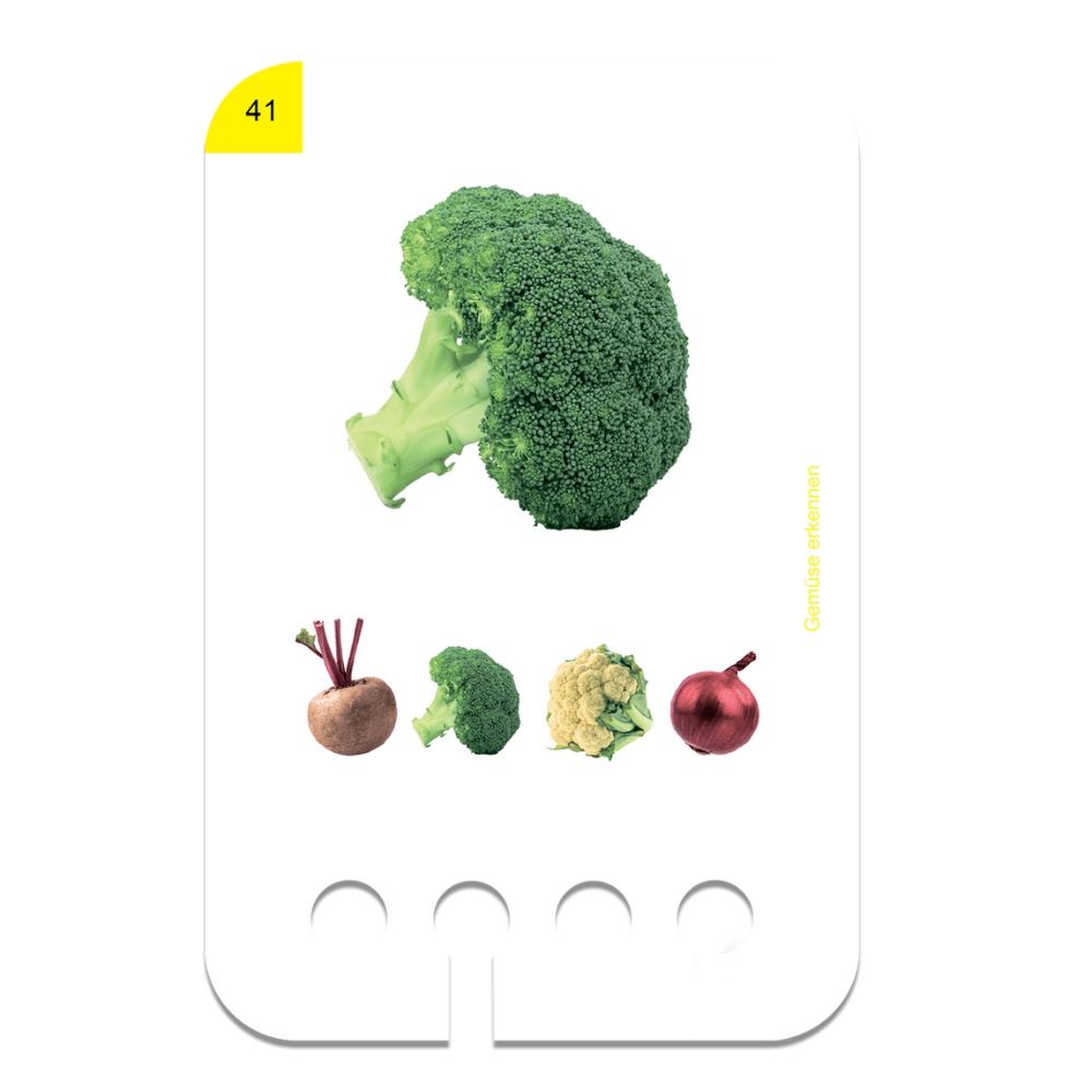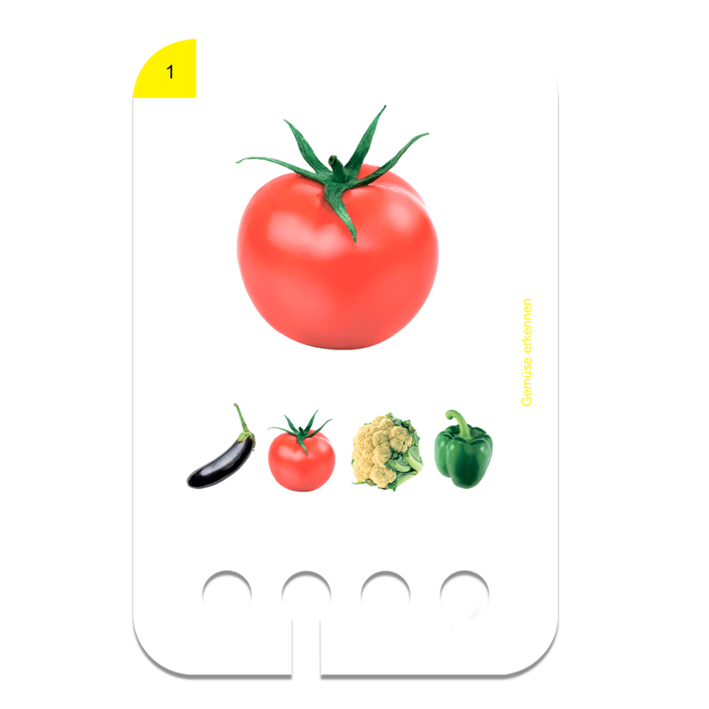 Gemüse erkennen 2+ vom Kölner Lernspielverlag ist ein Kartensatz zur Förderung der Wahrnehmung und Zuordnung von Gemüsen, konzipiert für Kleinkinder ab 2 Jahren. Die liebevoll gestalteten Lernkarten sind als Ergänzung für den Lochkasten gedacht und bieten abwechslungsreiche Übungen rund um das Thema Gemüse.
