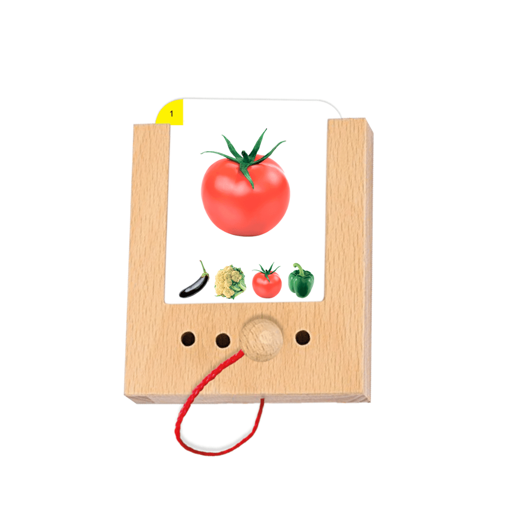 - Einfache Handhabung: Karten in den Lochkasten schieben, mit Holzstift Antwort wählen.