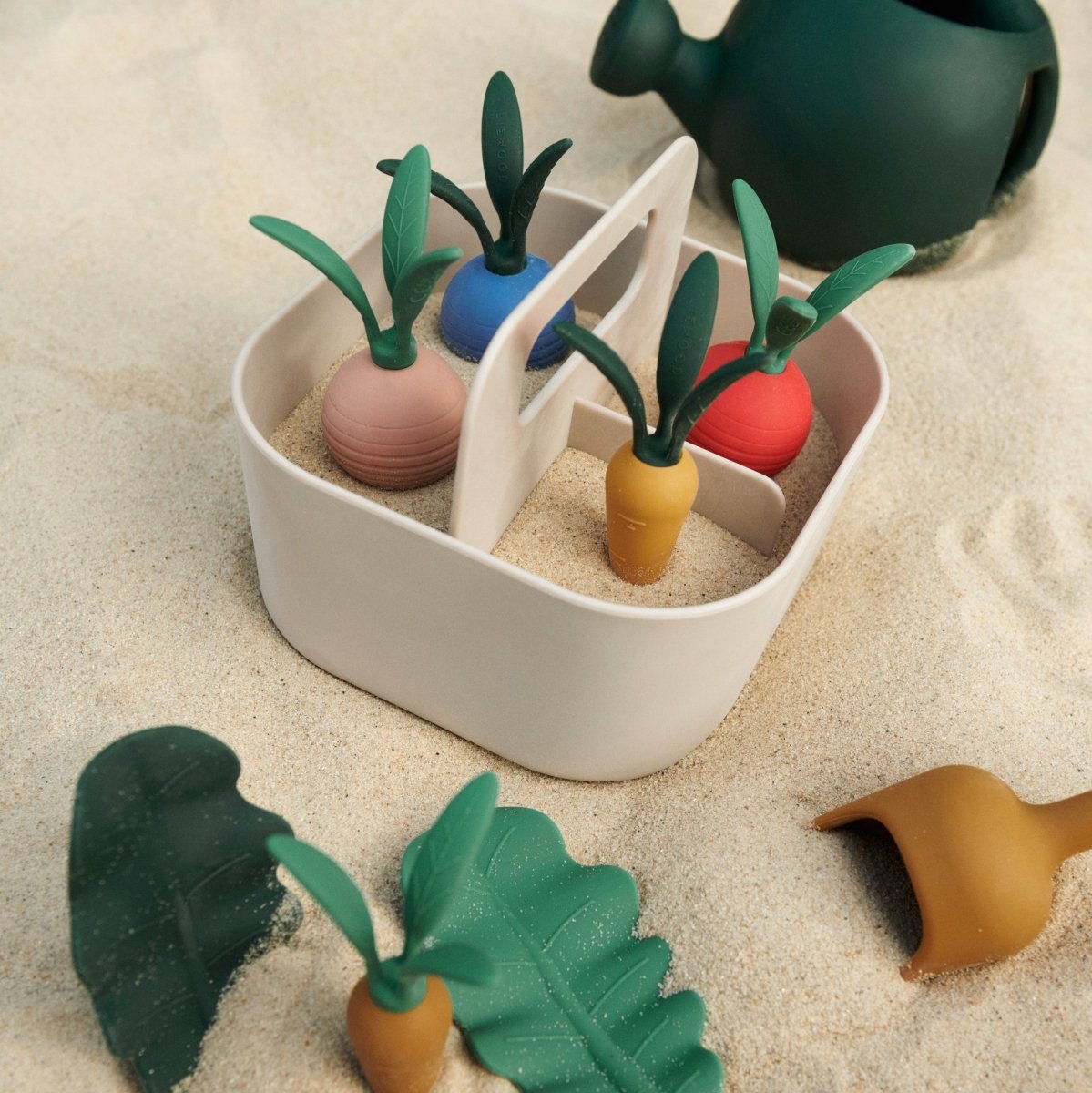 Bringen Sie die Natur direkt ins Kinderzimmer oder in den Garten: Das Gartenspielset von Liewood ist das ideale Outdoor-Spielzeug für kleine Gärtnerinnen und Gärtner! Das Set enthält eine kindgerechte Schaufel, zwei Karotten, drei Rüben, zwei Salatblätter und eine niedliche Gießkanne – alles aus angenehm weichem, langlebigem und farbenfrohem 100 % Silikon. Perfekt, um spielerisch das Pflanzen, Gießen und Ernten zu entdecken!